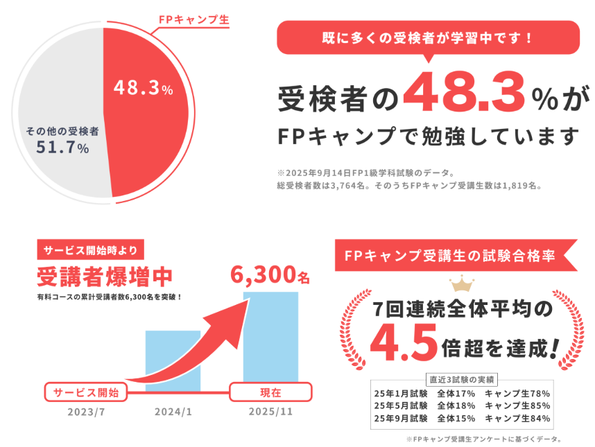 2023年7月の開講以来、有料会員数は6,300名以上、受講生の合格率は23年9月試験から25年9月試験まで7回連続で全体合格率の4.5倍超を記録しています。
