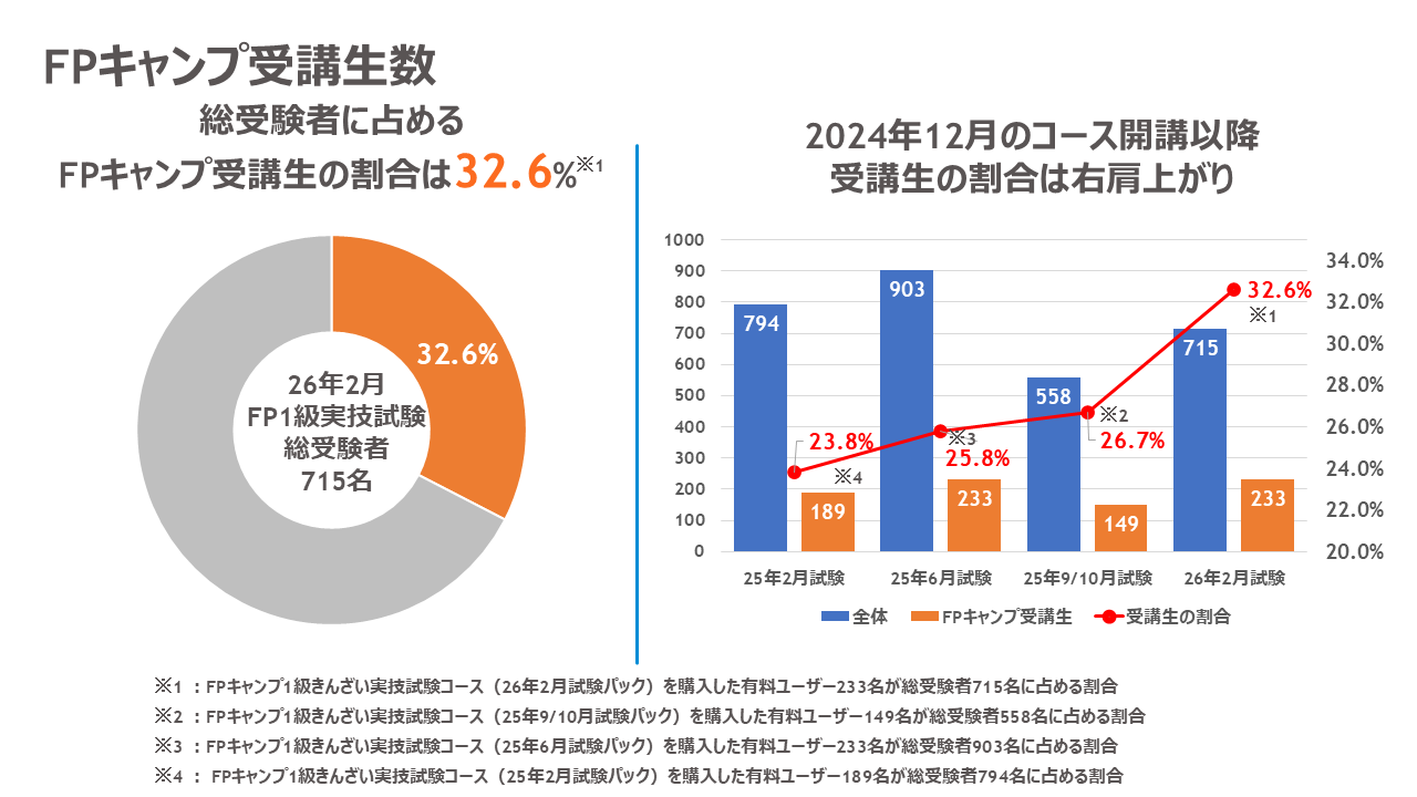 2026年2月のFP1級実技試験において、総受験者715名のうちFPキャンプ受講生は233名で、FPキャンプ受講生が占める割合は32.6%と全体の約3分の1を占めています。FPキャンプの1級きんざい実技試験コースが開講した2024年12月試験以降、受験者に占める受講生の割合は4回連続で右肩上がりの成長を続けています。