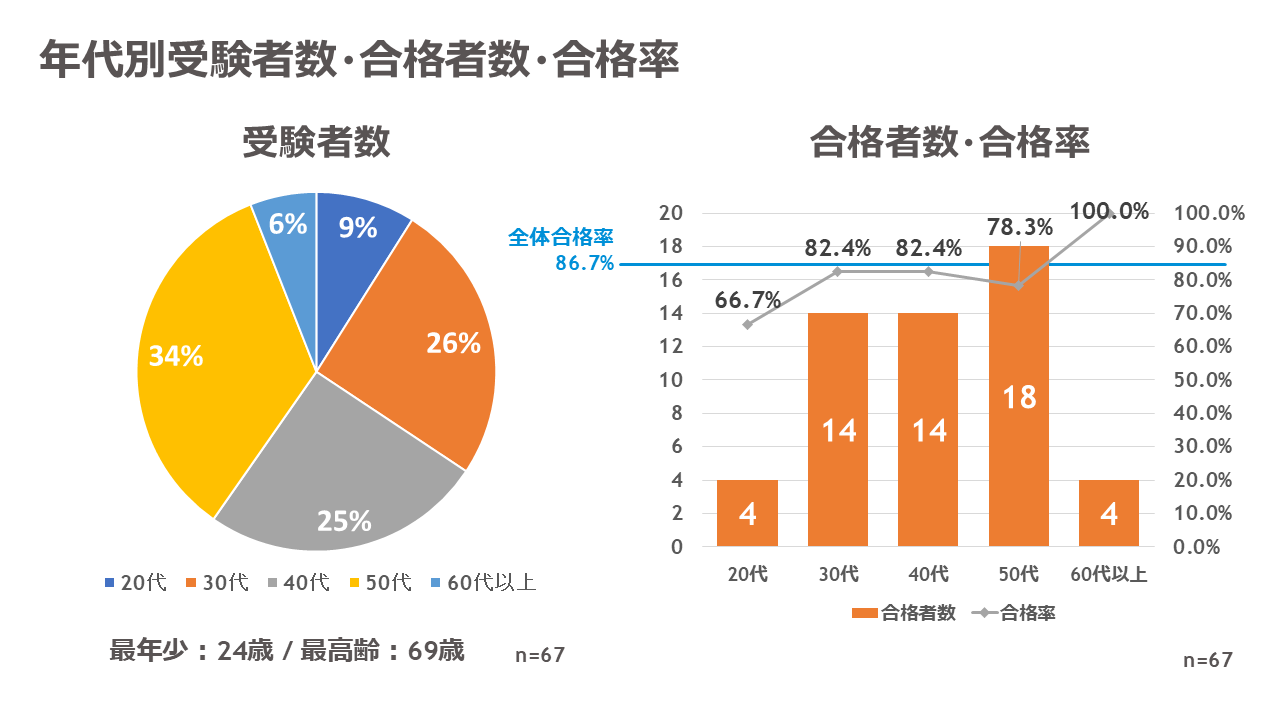 - 合格率は60代が100%と受験者全員が合格。次いで30代、40代が82.4%と高い合格率を残しました。