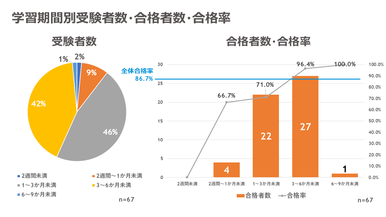 - 合格者数は3~6か月が最多の27名、次に1~3か月の22名と続きました。