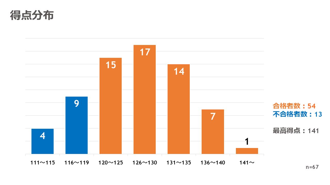 - 全体の得点分布をみると、合格者数は126~130点の層が最多で、次が120~125点、131~135点と続き、この3つの層で合格者数54名のうち46名と85%以上を占めました。加えて、136点以上の高得点合格者も全体の15%に上りました。最高得点は141点でした。