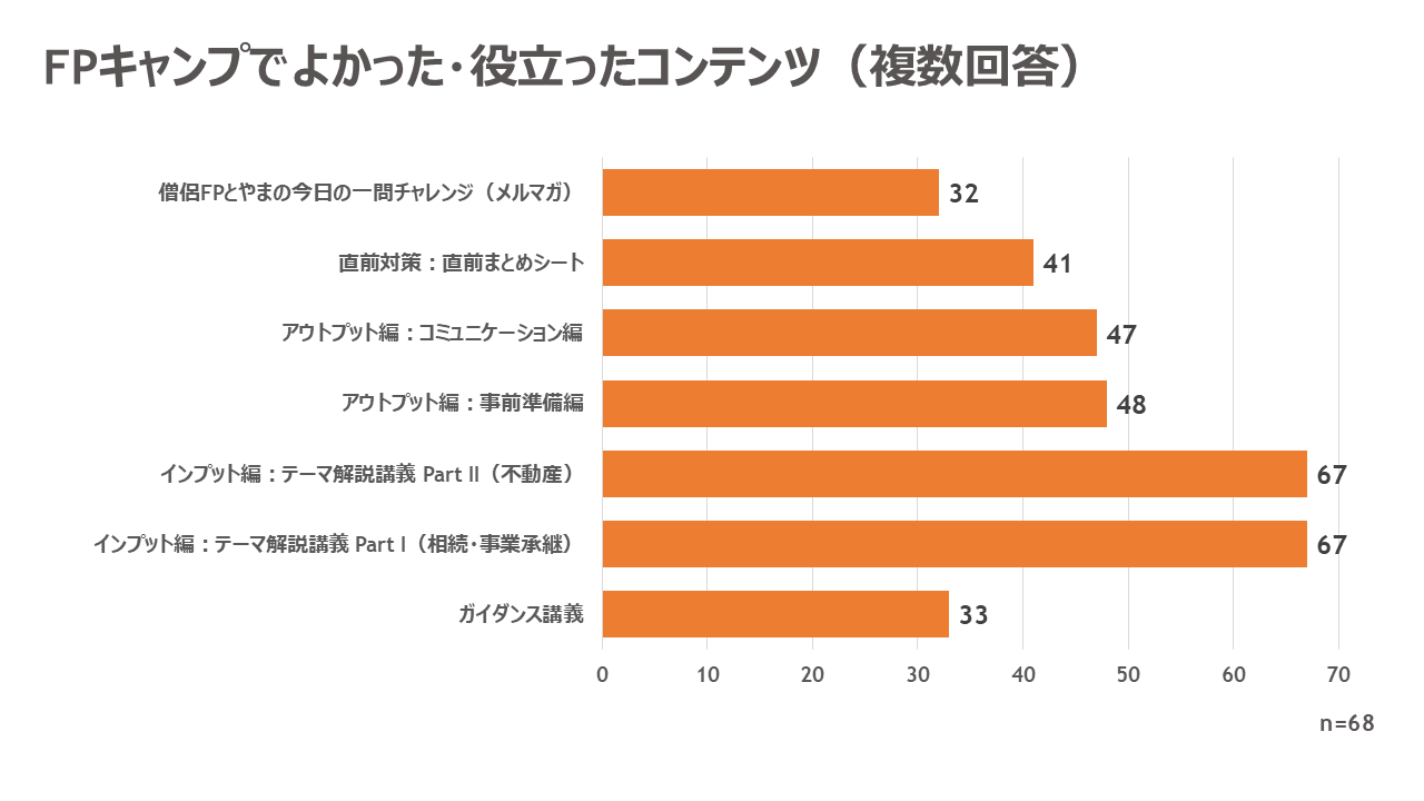 すべてのコンテンツが本当に役立ちました。FPキャンプは教材一つ一つが長くても約20分と短い中に、濃い内容を分かりやすい言葉で表現・解説できている点が最大の特徴であると思います