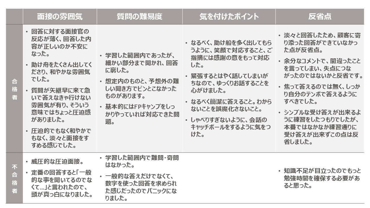 FP1級実技試験に占める受講生の割合や合格率といった試験データに加えて、FPキャンプを利用した感想や満足度、設例ごとの受験感想や実際の面接官の質問など貴重な情報も紹介していますので、次回以降のFP1級実技試験の受験の参考としてご活用ください。