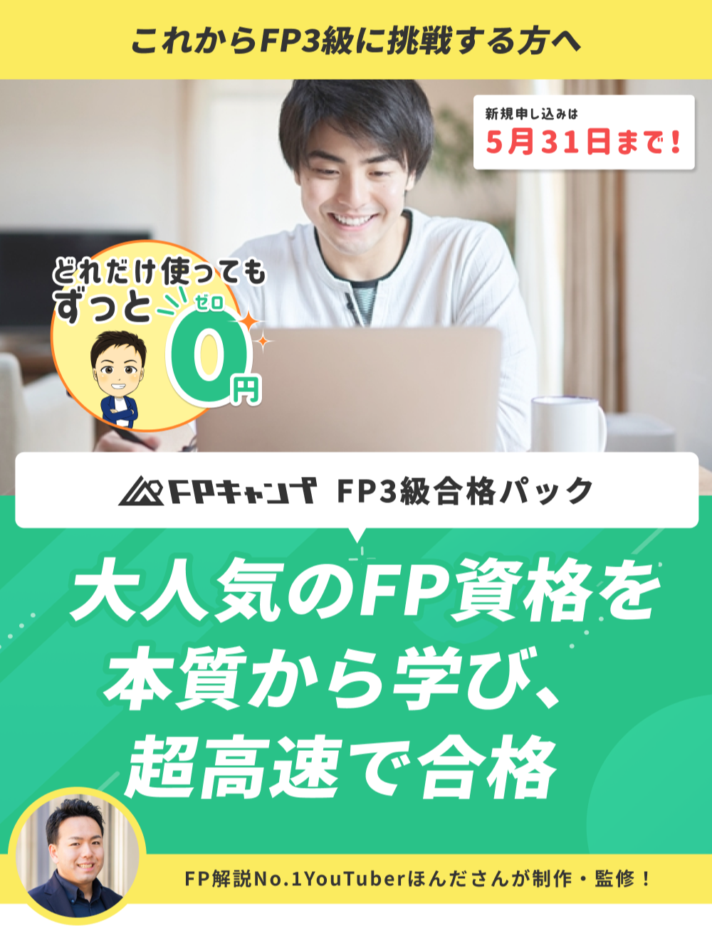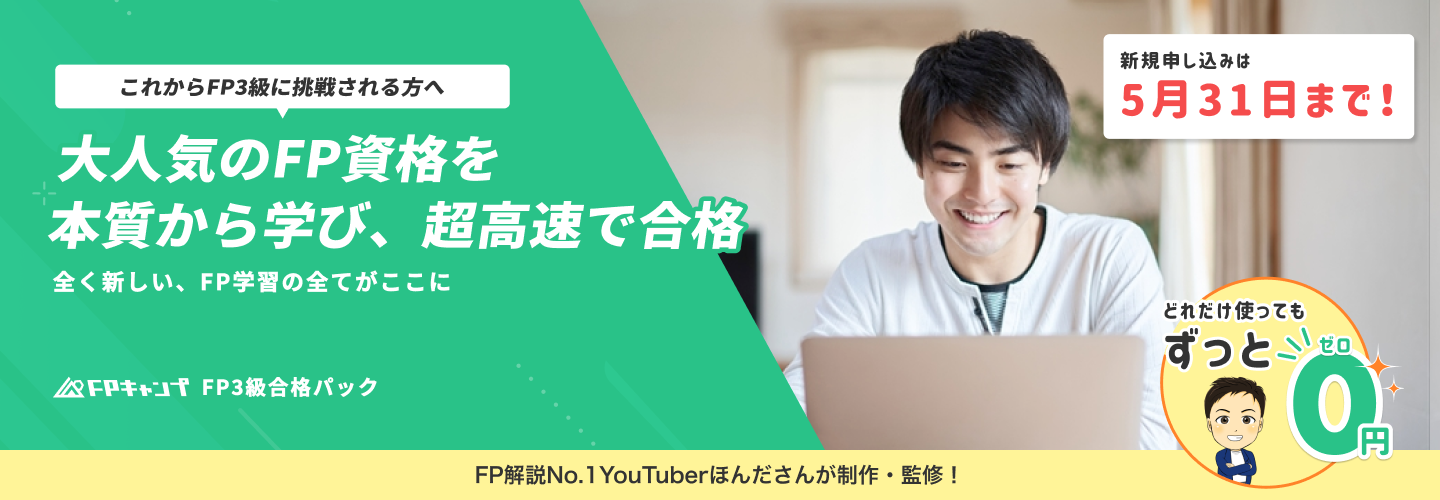 FPキャンプでは、FP3級の最短合格に向けて効率的に学習できるコンテンツ(講義動画や問題集、CBT模試他)を提供しています。2025年度版FP3級コースは2026年5月31日まで新規申込が可能ですので、お早めにお申し込みいただき5月までの合格を目指しましょう。